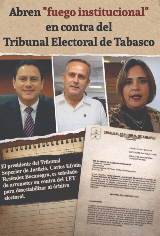 Hoy, la historia se repite una vez más. El sello de este ataque tiene su origen en las ambiciones de poder, negocios y privilegios que Espinosa Armengol busca mantener mediante la desestabilización de la institución, coordinando su ofensiva en contra del TET con el presidente del Tribunal Superior de Justicia de Tabasco, Carlos Efraín Reséndez Bocanegra, quienes conjunta y coordinadamente intentan influir en las acciones y decisiones del propio Tribunal.