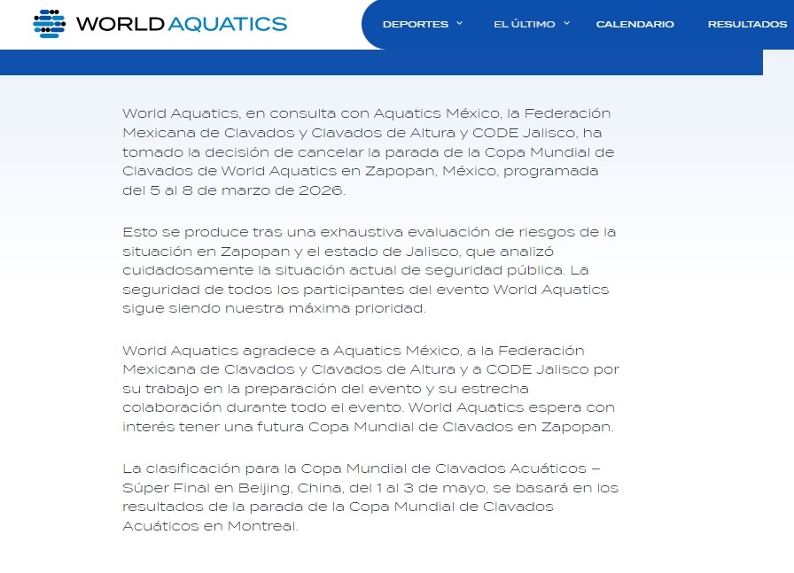 «World Aquatics, en consulta con Aquatics México, la Federación Mexicana de Clavados y Clavados de Altura y CODE Jalisco, ha tomado la decisión de cancelar la parada de la Copa Mundial de Clavados de World Aquatics en Zapopan, México, programada del 5 al 8 de marzo de 2026.