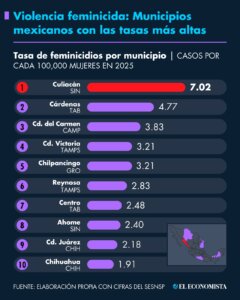 El municipio con la tasa más alta al cierre del 2025 fue Culiacán, Sinaloa con 7.02 feminicidios por cada 100,000 mujeres, de acuerdo con cifras del Secretariado Ejecutivo del Sistema Nacional de Seguridad Pública (SESNSP).