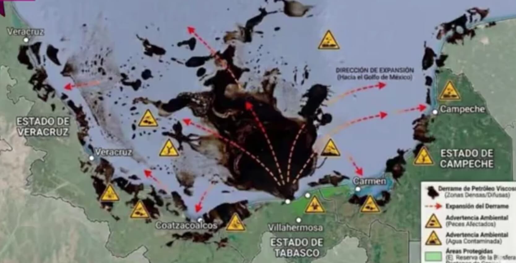 A partir de imágenes satelitales, organizaciones ambientalistas denunciaron el derrame de hidrocarburo en el golfo de México, que ha afectado una extensión de 630 kilómetros de litoral en los estados de Veracruz y Tabasco, inició en febrero en aguas del estado de Campeche, sureste del país.