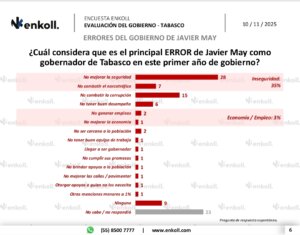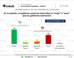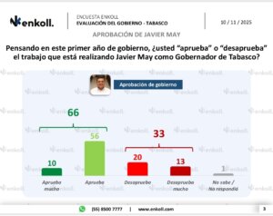 La encuestadora Enkoll evaluó el desempeño del gobernador de Tabasco, Javier May Rodríguez al ajustar un año al frente de administración pública estatal.