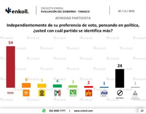 En cuanto a afinidad partidista, Morena conserva una amplia identificación en Tabaco con 54% de la población; le siguen MC, con 6%; PRD, con 5%; PRI, con 4%; PVEM, con 3%; PT, con 2%, y PAN, con 1%. Mientras que 24% de los encuestados se declara apartidista.