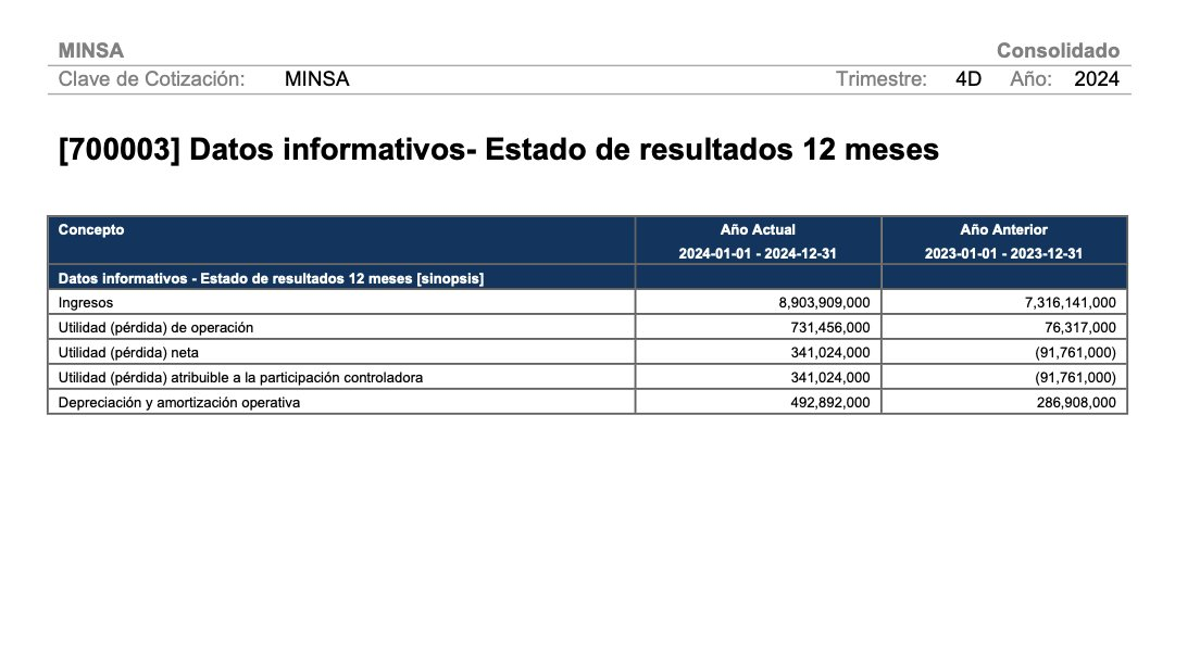De acuerdo a su estado trimestral del año pasado, que envía a través de su área de relación con inversionistas a la Bolsa Mexicana de Valores, Minsa tuvo un total de 8 mil 903 millones de pesos de ingresos en el año 2024.