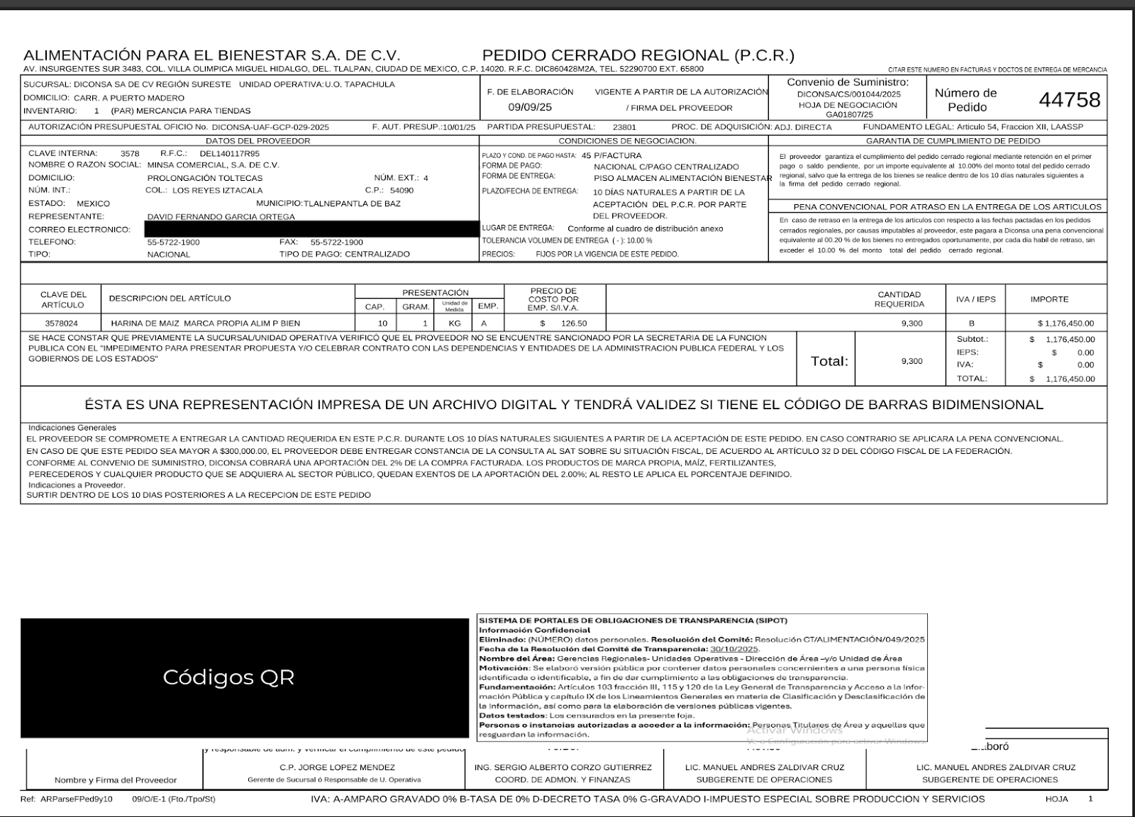 Federación (Histórica) FED – Alimentación para el Bienestar, S.A. de C.V. Adjudicación directa MINSA COMERCIAL, S.A. DE C.V. 50344758 $1.176.450,00