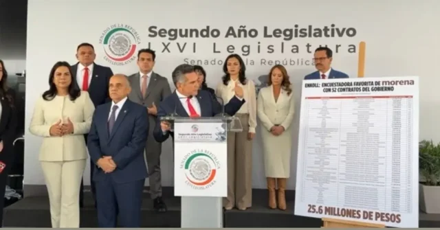 Moreno Cárdenas señaló que la casa encuestadora ENKOLL, a la que calificó como “brazo ejecutor de Morena”, ha recibido contratos millonarios de diversas dependencias del gobierno federal, entre ellas Lotería Nacional, Secretaría de Salud, Comunicaciones, Fonatur, SEMAR, IMSS, Secretaría de Gobernación, Bancomex y Notimex. Secretaría de Gobernación, Bancomex y Notimex. Según el líder priista, estos contratos buscan difundir encuestas y generar percepción de apoyo ciudadano que no refleja la realidad política del país. También afirmó que dichos contratos ascienden a un monto estimado de 25,6 millones de pesos.