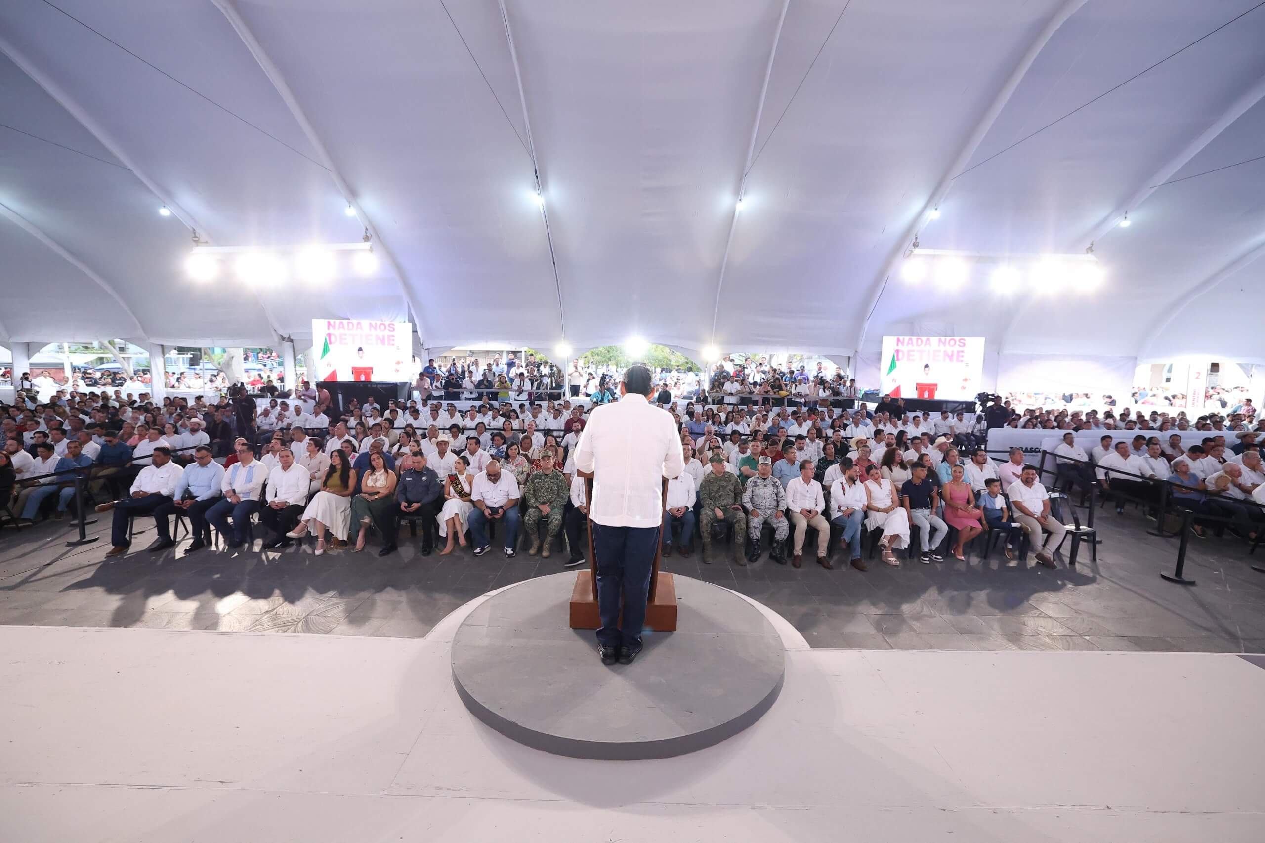 En Tabasco el poder ahora lo tiene el pueblo y con su respaldo la transformación avanza sin desviar su rumbo, sin abandonar a la gente y como un movimiento invencible, que del pensamiento pasa a la acción y de la acción al corazón, afirmó el Gobernador Javier May Rodríguez ante miles de tabasqueñas y tabasqueños que este viernes abarrotaron la histórica Plaza de Armas, en el epicentro de Villahermosa.