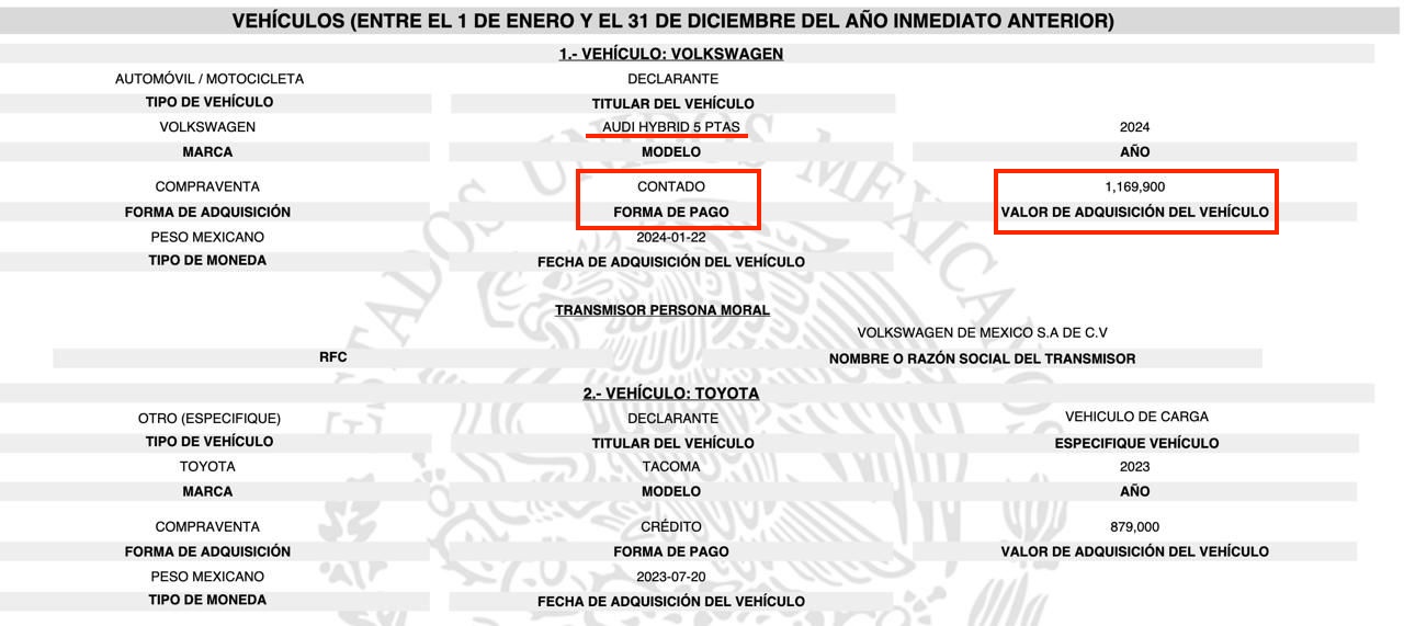 En el rubro de vehículos, la delegada reportó dos unidades adquiridas en los últimos dos años. En 2024 declaró un Audi Hybrid 5 puertas comprado de contado el 22 de de enero de 2024 por 1,169,900 pesos. El otro vehículo es una Toyota Tacoma (2023): camioneta de carga adquirida mediante crédito el 20 de julio de 2023, con un costo de $879,000 pesos.